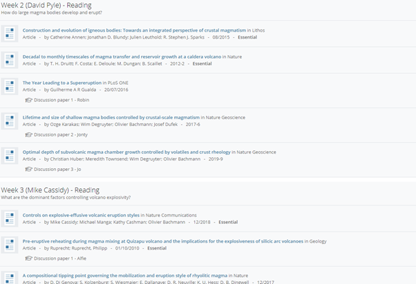 The final year of the Earth Sciences course is geared to developing the cognitive skills of students, and these journal club seminars focus on the development of critical thinking. Teams based seminars are held around a weekly topic. For each seminar students are provided with five papers through ORLO. Two of these papers give background knowledge and three concise and contemporary research papers provide content for discussion in the seminar. Three students are pre-selected to present these, sometimes contentious, papers. Students are also chosen on a rota basis to head discussions whilst the instructor takes the role of mentor.
